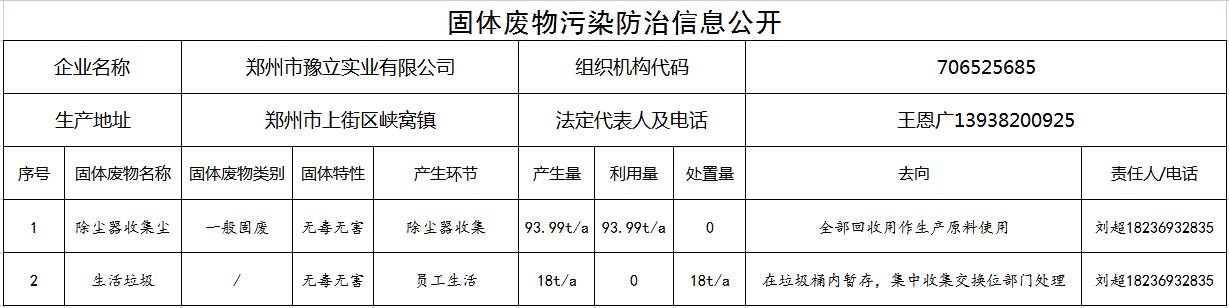 鄭州市豫立實(shí)業(yè)有限公司固體廢物污染防治信息公開...